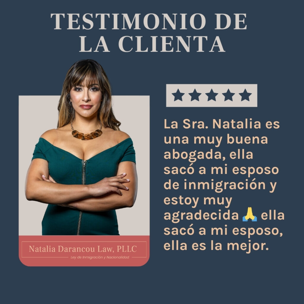 ¡Recomiendo ampliamente a la abogada Natalia como su abogada! Es muy buena trabajando en casos difíciles como el de inmigración. Le apasiona su trabajo y hace lo que debe para luchar por su caso. ¡No se arrepentirá de pedirle ayuda! Gracias por todo el trabajo duro que hace por sus clientes.
